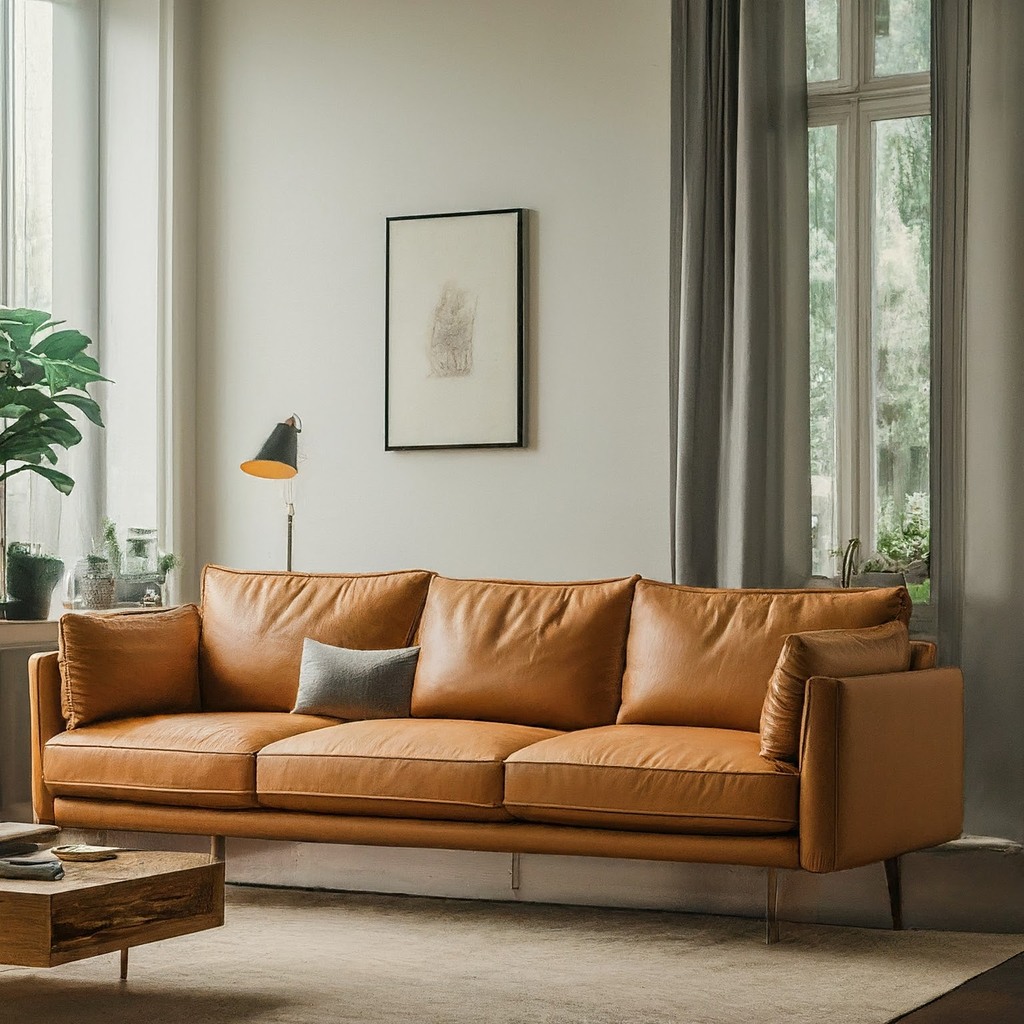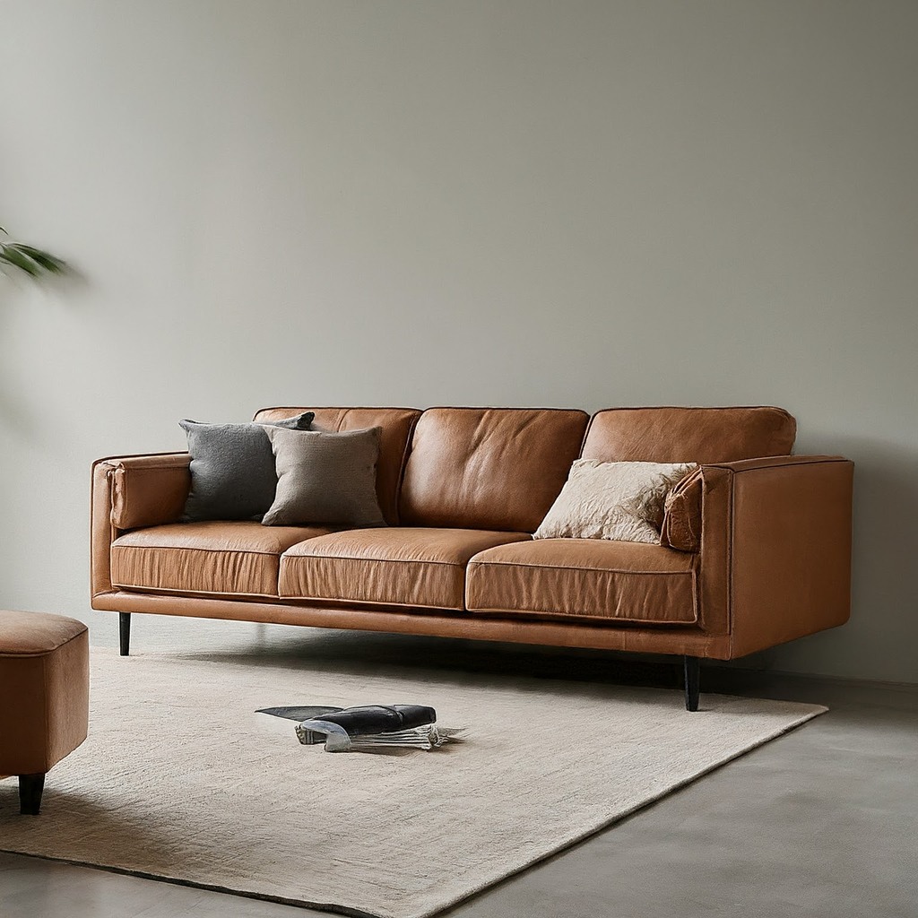 Tan leather three-seater sofa. It has clean lines, low-profile arms, and black metal legs, giving it a sleek and contemporary look.