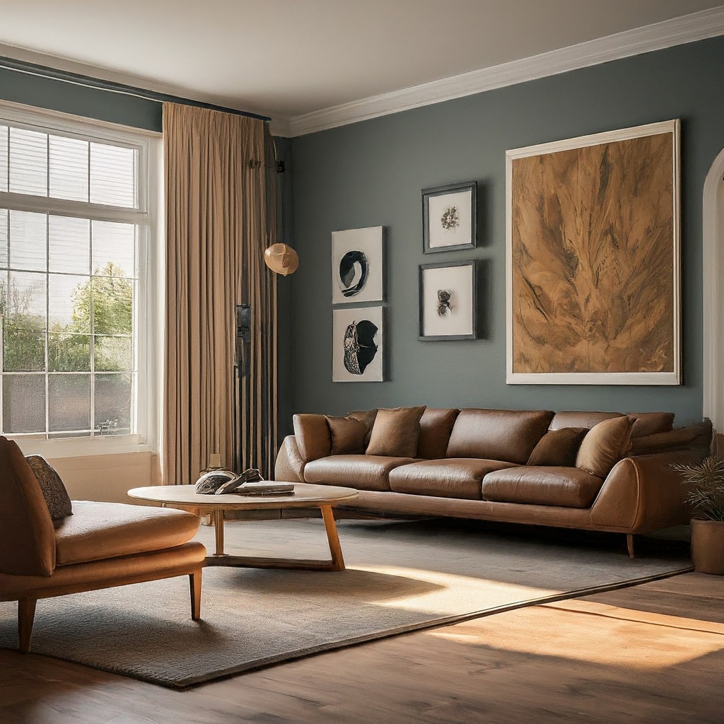 The sofa is a tan leather corner sectional. It has clean lines and low-profile arms, giving it a sleek and contemporary look.